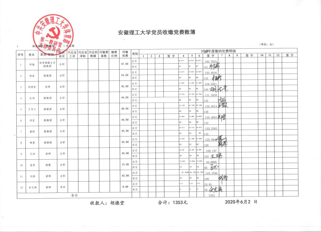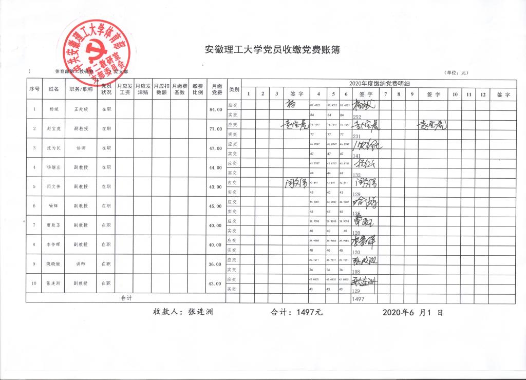 根据学校《关于印发<中共安徽理工大学委员会关于党费收缴、使用和管理的实施办法(修订)>的通知》要求,现将2020年第二季度体育部党总支各党支部收缴党费情况公示如下,请传达到每一位党员,使他们了解我部2020年第二季度党费收缴情况,增强广大党员按照规定交纳党费的自觉性。