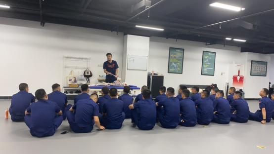 杜鸿老师为消防队员指导平时训练中的注意事项,以及出现损伤后的康复问题。强调运动前的准备活动和运动后拉伸的重要性,同时进行分组示范,从骨骼肌到大小肌肉群进行拉伸放松。通过精心指导和分组实操训练,并对部分伤病消防队员进行康复治疗,受到了消防队员们的一致好评,并希望今后可以多来指导,从科学化训练原则方面带动消防技能的提高。