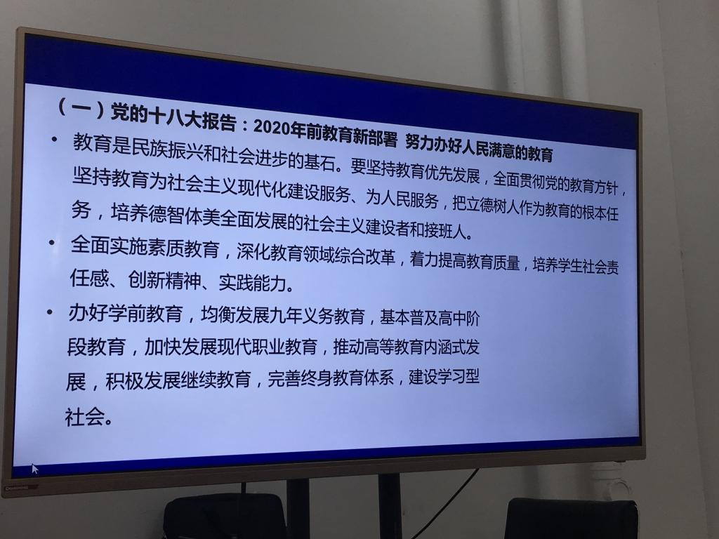 根据体育部党总支《关于举办2018年体育部党总支全体党员、新任党总支委员和党支部委员培训班的通知》(体育发〔2018〕17号)的布置要求,11月12日中午,在至诚体育场A104室召开总支委员和党支部委员观看张力教授《“十三五”期间教育改革发展相关政策解读》的学习活动。张教授从“四个全面”战略布局对教育改革发展的总体要求和“十三五”时期基础教育改革发展环境和政策要点等方面进行了详细的阐述,使总支委员和党支部委员对“十三五”期间教育改革发展相关政策有了新的认识,达到了本次学习的目的。