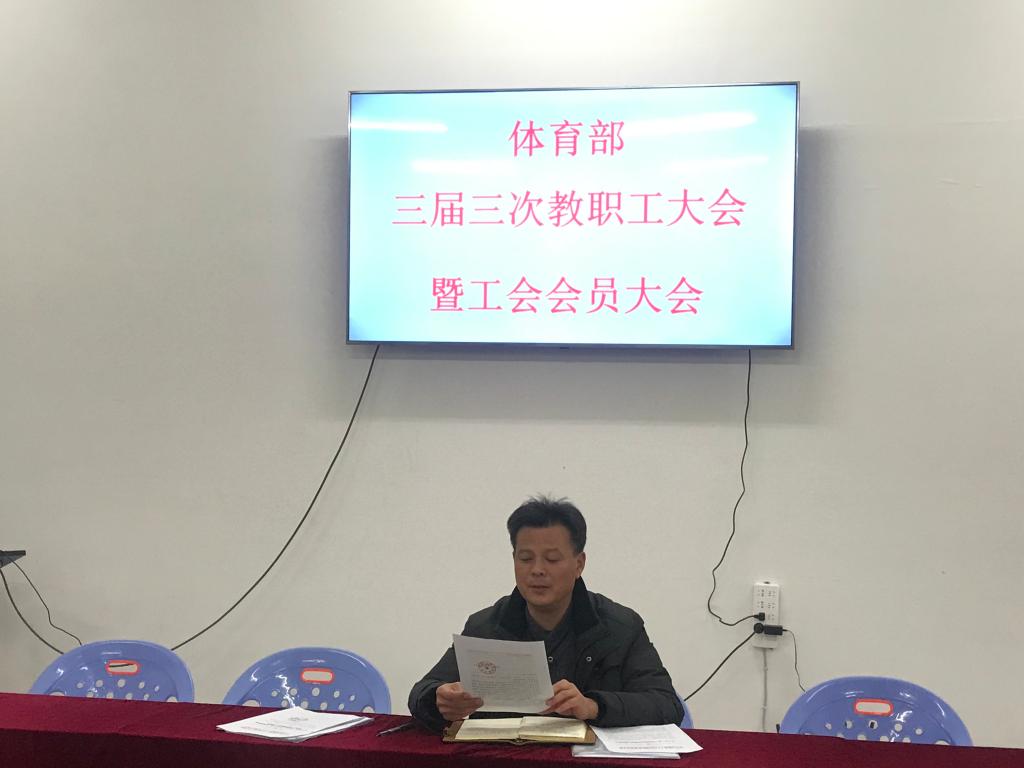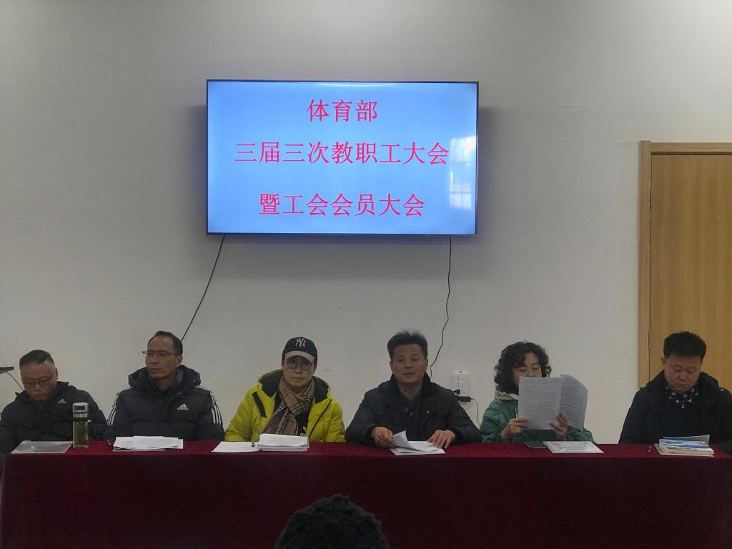 1月12日,体育部三届三次教职工大会暨工会会员大会在至诚体育场A105会议室召开。大会由体育部党总支书记、主任邹瑞主持,全体教职工参加了大会。