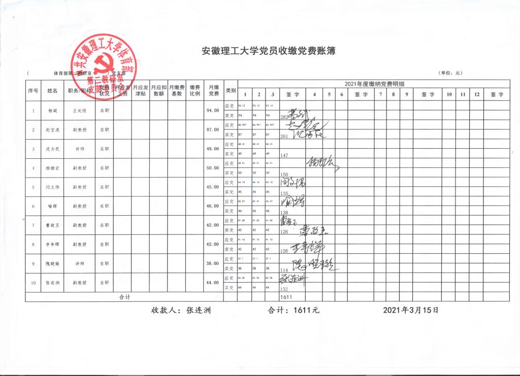 根据学校《关于印发〈中共安徽理工大学委员会关于党费收缴、使用和管理的实施办法(修订)〉的通知》要求,现将2021年第一季度体育部党总支各党支部收缴党费情况公示如下,请传达到每一位党员,使他们了解我部2021年第一季度党费收缴情况,增强广大党员按照规定交纳党费的自觉性。