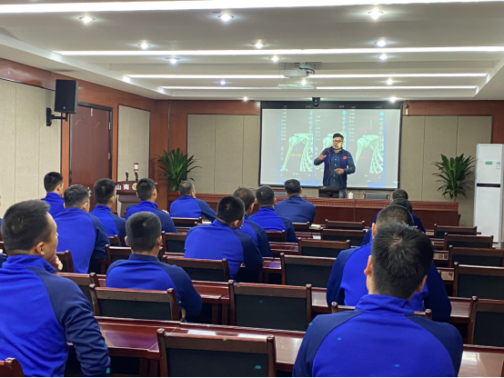 杜鸿老师为全体指战员细致讲解人体构造、肌肉组成、训练前热身、韧带拉伸、训练后肌肉放松等知识,引导指战员科学训练,提高身体素质。课后,杜老师结合自身多年理论、实践经验,针对训练和救援中受损伤的队员进行康复指导,对受伤的原因进行分析,并进行康复治疗。