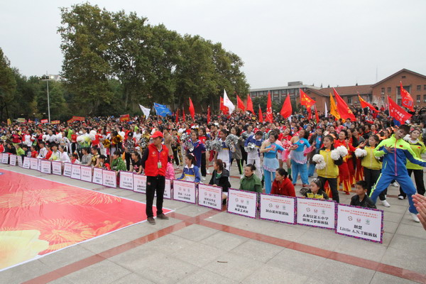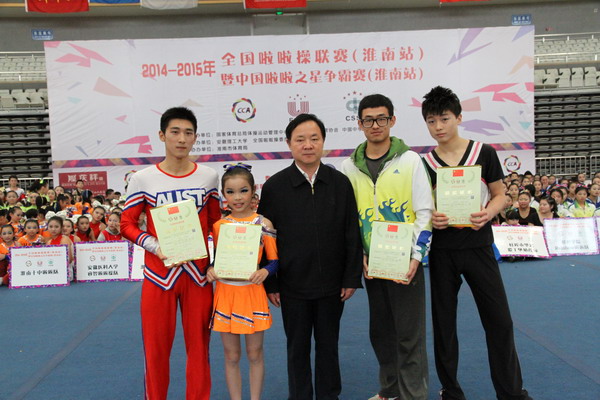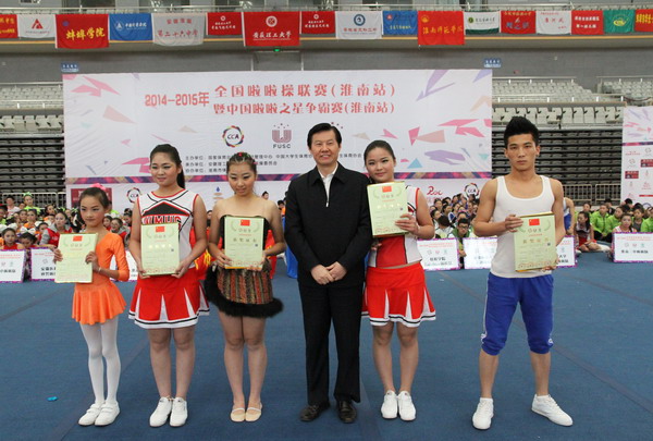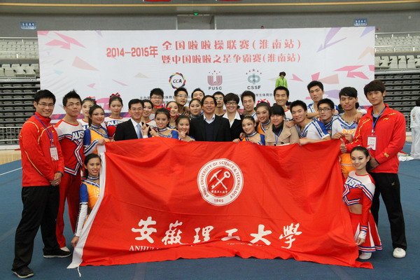 8日下午,2014-2015年全国啦啦联赛(淮南站)暨中国啦啦操之星争霸赛(淮南站)在我校教学楼前广场举行开幕式。校党委书记颜事龙,国家体育总局体操运动管理中心中国体操领队叶振南,淮南市人民政府副市长阮怀楼,我校副校长叶醒狮、刘泽功、孟祥瑞、校纪委书记周峰,淮南师范学院纪委书记周学锋,淮南市体育局局长金昶,全国啦啦操委员会副秘书长李育林,我校学院(部)和相关职能部门负责人出席开幕式并在前排就座。