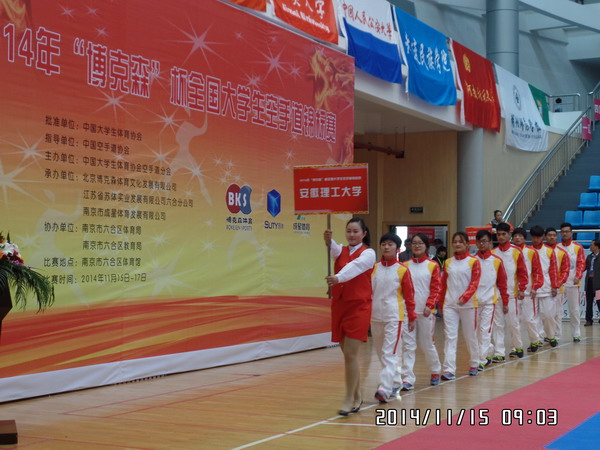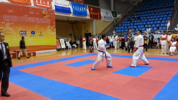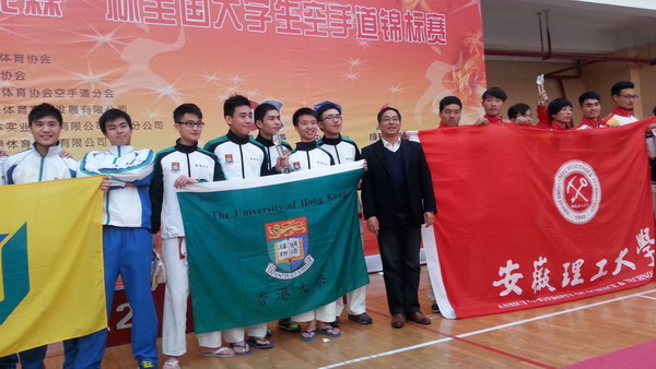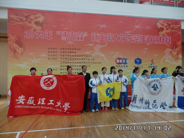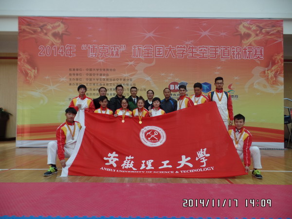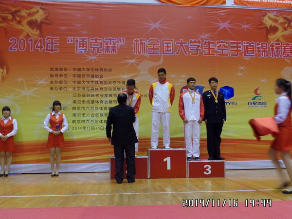11月17日下午,由南京市六合区承办的2014中国大学生空手道锦标赛在六合区体育馆落下帷幕,来自香港大学、香港浸会大学、香港城市大学、中国人民公安大学、集美大学、北京体育大学、上海体育学院、上海理工大学、首都体育学院、合肥工业大学等28所高校代表队300余名运动员参加了比赛。我校代表队参赛的10名运动员经过3天69场登台角逐,以2金4银4铜的优异成绩,列C组18所高校奖牌榜总数第二(香港城市大学第一),同时创造了我校空手道队参加国家级赛事的最好成绩。