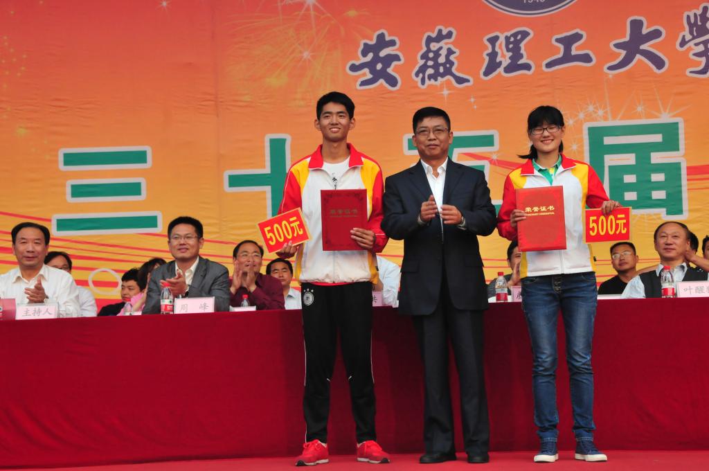 校党委书记颜事龙为打破校纪录的学生机械工程学院王健、地球与环境学院李欣芳颁奖。
