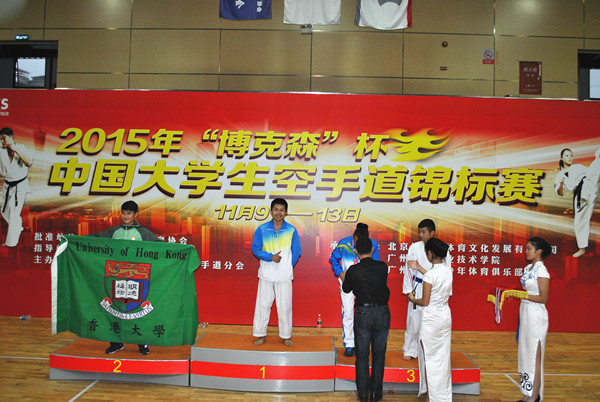 11月13日,由中国大学生体育协会空手道分会主办的2015年“博克森”杯中国大学生空手道锦标赛在广州体育职业技术学院落幕,共有来自香港大学、香港理工大学、上海理工大学、中国人民公安大学、集美大学、西安体育学院、香港浸会大学、合肥工业大学等30所高校的325名运动员参加了本次比赛。