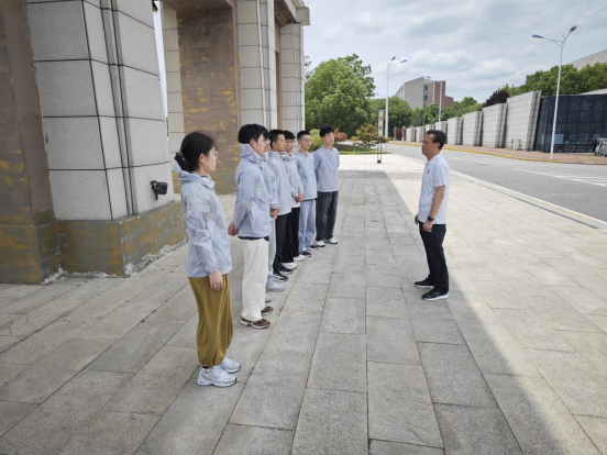 6月18日中午,体育部党总支书记、主任邹瑞在校南门为即将参加2025年安徽省学生体育联赛大学生武术比赛的校武术队作出征动员。